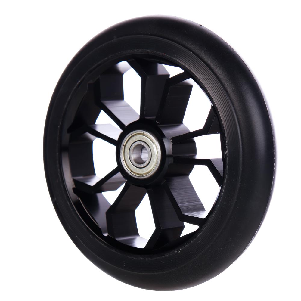 Колесо для трюкового самоката диаметром 120 мм изготовлено из фрезерованного алюминия и полиуретана, что обеспечивает превосходную прочность, отличную устойчивость, износостойкость и сцепление с поверхностью. Снабжено подшипниками ABEC9, которые обеспечивают оптимальную надежность, скорость и накат.