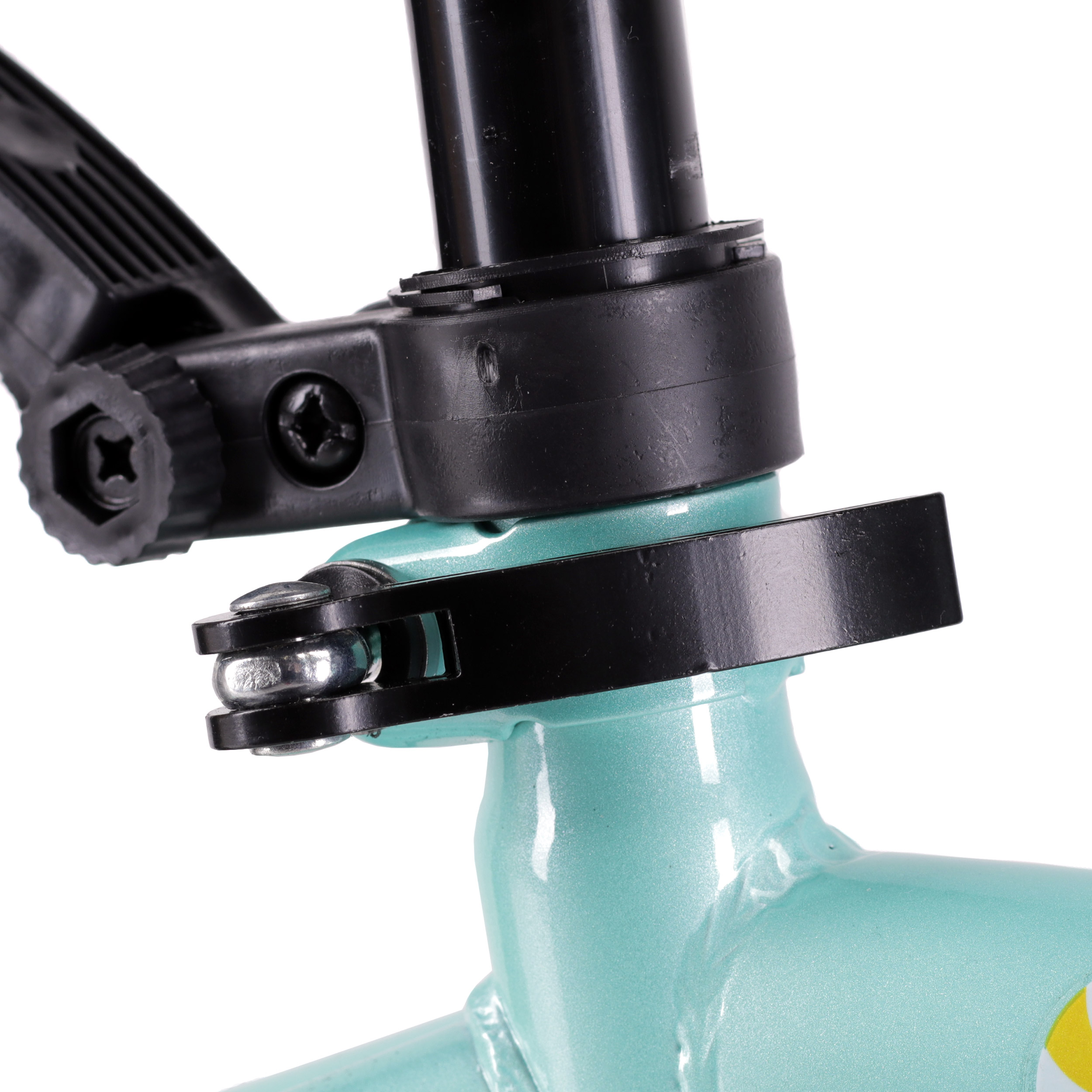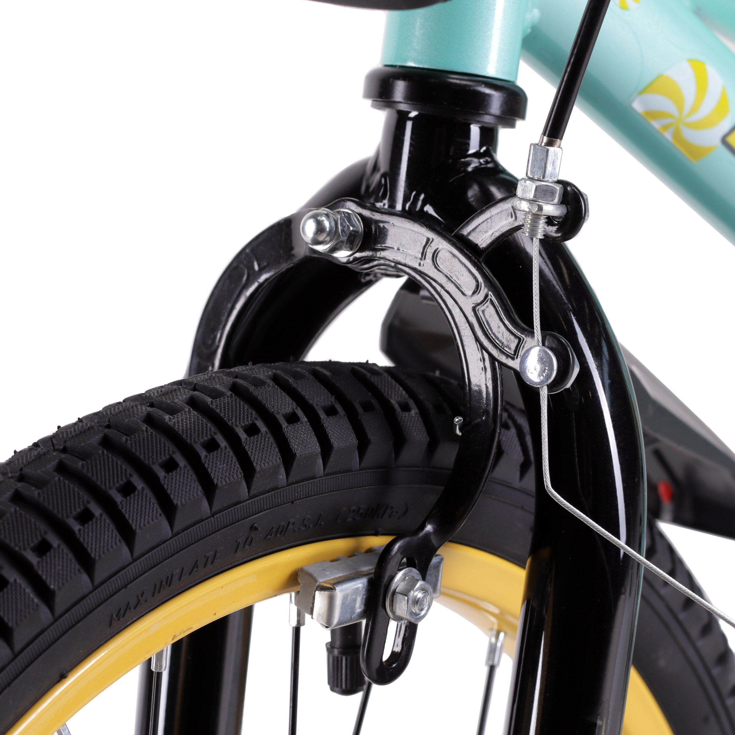 У Candy Sky 20" очень правильная для этой ниши конструкция. Здесь стальная рама Hi-Ten, жёсткая стальная вилка, одна скорость, передний клещевой тормоз и задний ножной тормоз. Для детского велосипеда это как раз сильная сторона, а не упрощение. Ребёнку не нужно разбираться в переключателях, не нужно привыкать к сложной логике управления, а торможение остаётся максимально интуитивным: ногой назад и ручкой спереди. Производитель отдельно подчёркивает и наличие защитных элементов: защита цепи, пластиковые крылья, приставные колёса, а также детское седло с ручкой, за которую велосипед удобно придерживать или переносить. Это типично «родительские» детали, но именно они часто делают модель действительно удобной в быту.