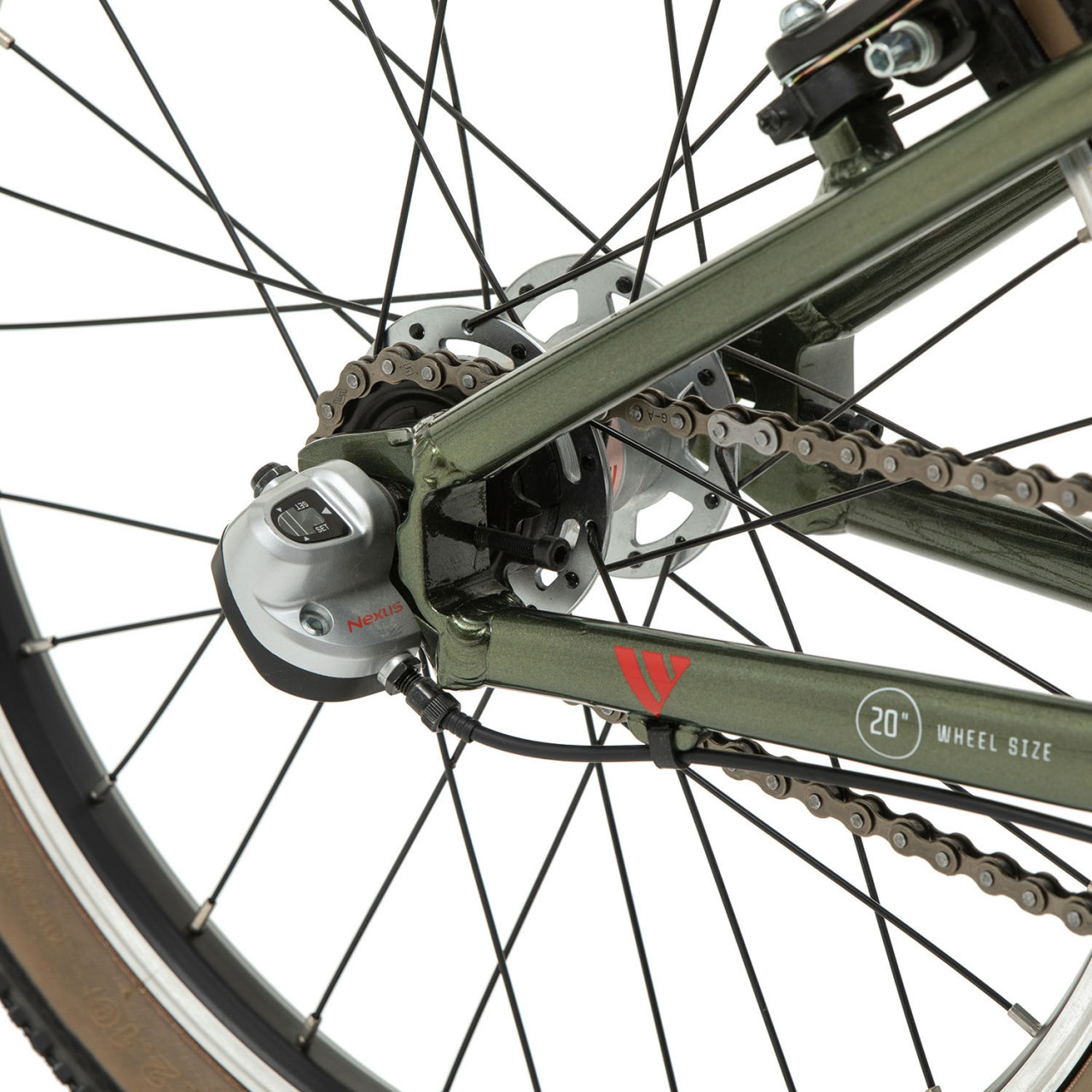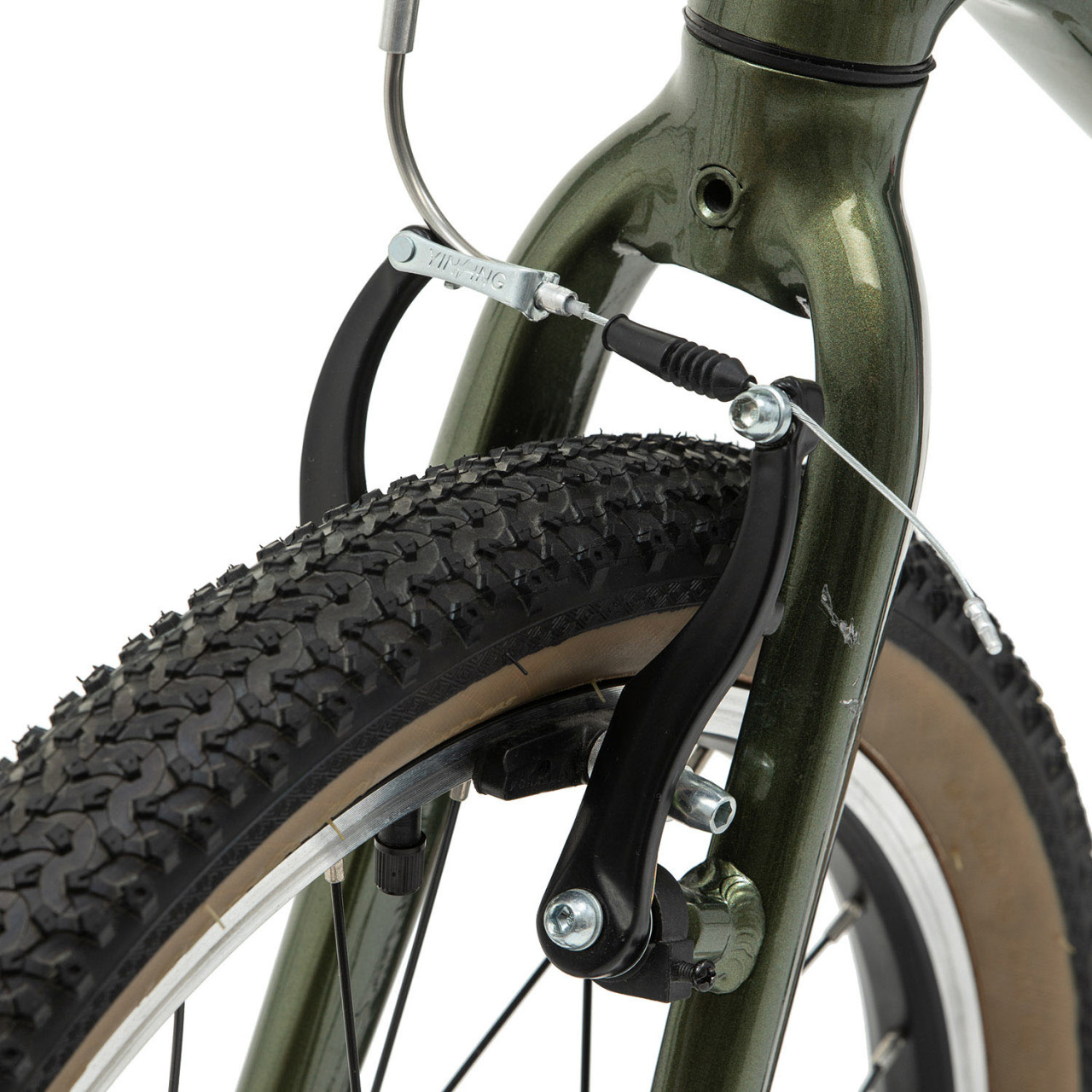 Тормоза здесь ободные V-Brake с короткими ручками — для подростковой руки это плюс, потому что усилие на торможении понятное и комфортное. Колёса собраны на двойных ободах, втулки — на промподшипниках, а резина Kenda K1177 20×2.1 Tanwall даёт хороший баланс: велосипед не кажется “жёстким”, но и не превращается в тяжёлый прогулочный круизер.