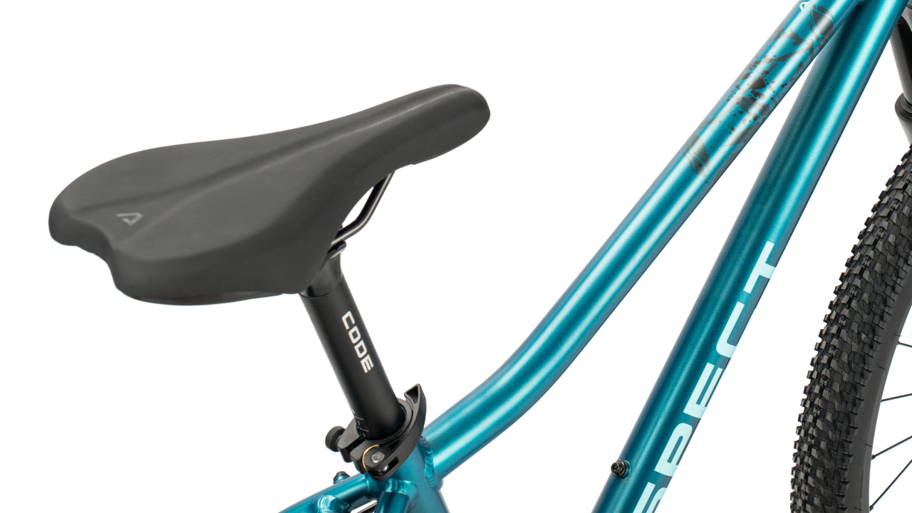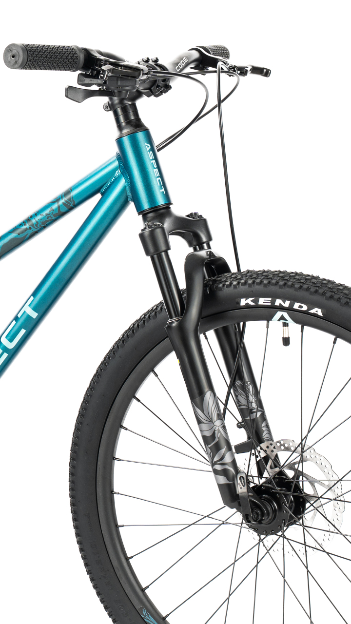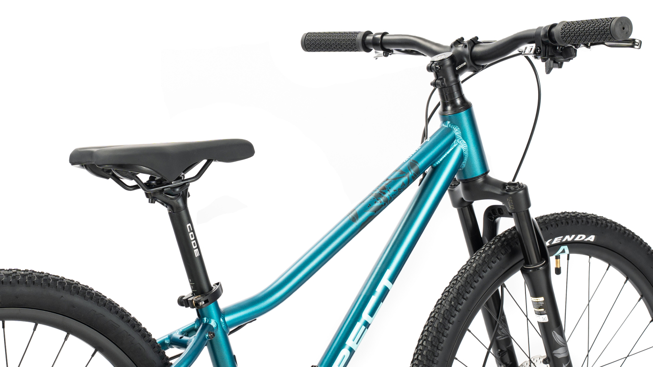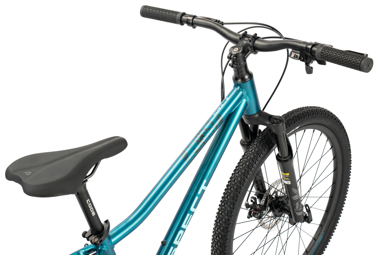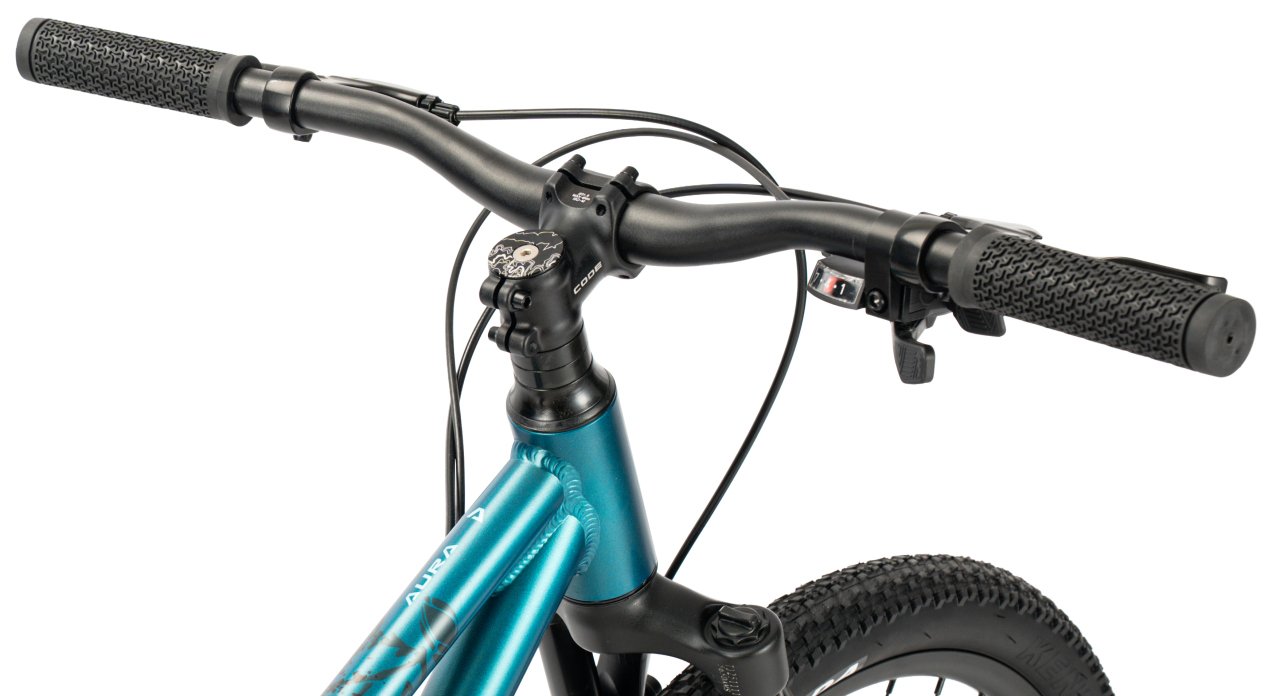 Одна из ключевых причин, почему Aura 24 воспринимается удачной моделью, — это сочетание 24-дюймовых колёс, относительно лёгкой рамы и амортизационной вилки ZOOM 565D с ходом 80 мм. Для подросткового велосипеда это хороший баланс: передняя вилка уже помогает на плитке, бордюрах и грунтовых дорожках, но сам велосипед не превращается в тяжёлую и ленивую машину. Кокпит тоже собран разумно: руль Code Kids JR 620 мм, вынос 50 мм, система Prowheel 32T×140 мм. То есть посадка у модели не случайная: ребёнку не приходится тянуться слишком далеко, а управление остаётся понятным и предсказуемым.