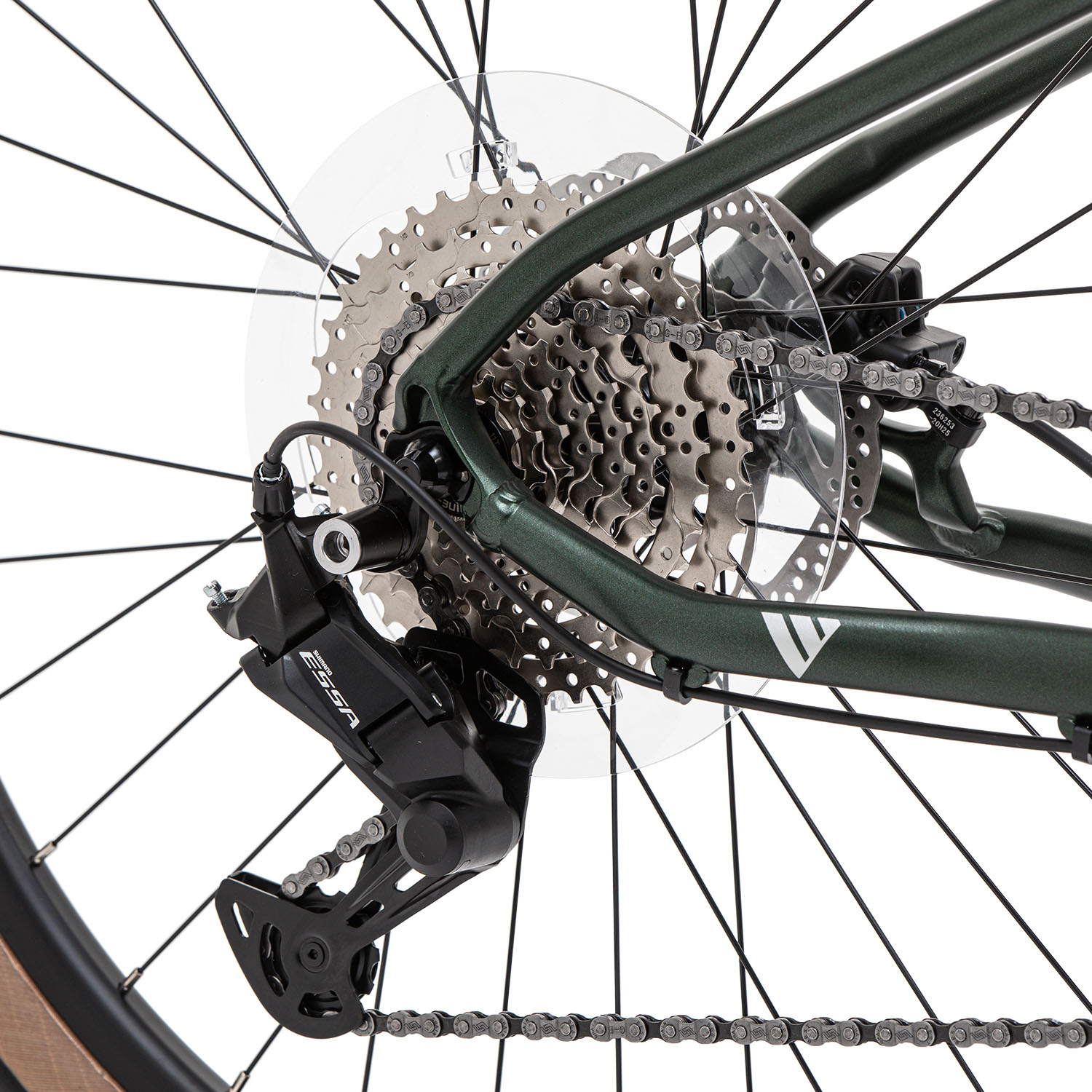Трансмиссия здесь 1×8 на новом переключателе Shimano Essa (манетки Altus SL-315) — простой и понятный формат: одна звезда спереди, передачи переключаются логично, обслуживается без редких деталей.