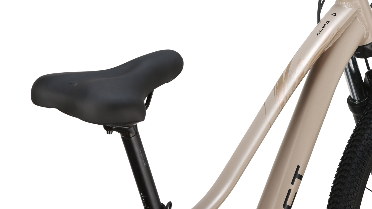 У модели алюминиевая рама 6061 с гидроформингом, внутренней проводкой, коническим рулевым стаканом, резьбовой кареткой BSA, креплением под аксессуары и женской геометрией. То есть это не просто “женская модель по цвету”, а действительно адаптированная по геометрии платформа. Alma рассчитана на дополнительный комфорт в поездках и имеет весь набор крепёжных узлов под аксессуары.