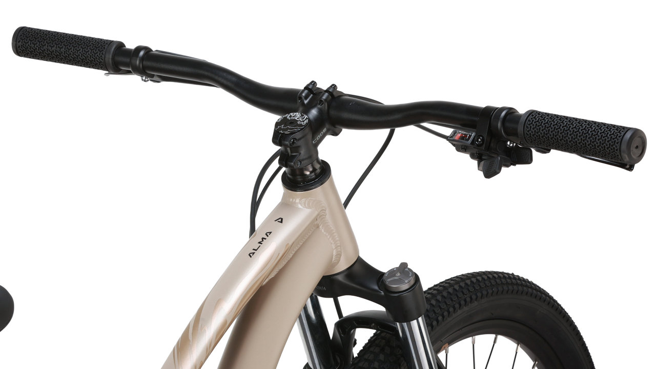 Формат 26" в Alma работает не как ограничение, а как часть её характера. Велосипед получается более компактным, манёвренным и понятным на небольших скоростях, а для невысокого роста или тех, кто не любит длинные 27.5 и 29, это часто оказывается именно тем, что нужно. Спереди стоит EXSHO JUNGLE ML-P — пружинно-эластомерная вилка с блокировкой, ходом 100 мм и 30-мм ногами. Для комфортного женского MTB это удачное решение: вилка не пытается изображать спортивный уровень, но честно помогает на бордюрах, плитке, плохом асфальте и грунте. При этом блокировка полезна на ровной дороге, когда хочется более плотного хода и меньшей раскачки. Плюс у рамы есть полезные с точки зрения ресурса и жёсткости детали: конический рулевой стакан и гидроформинг. Производитель прямо поясняет, что конусный стакан помогает лучше распределять нагрузку и повышает конструктивную прочность рамы, а гидроформинг даёт более чистую форму труб без лишних косынок и при этом сохраняет лёгкость. Это не “маркетинговые слова ради каталога”, а вполне рабочие инженерные решения для велосипеда, который должен служить спокойно и долго.