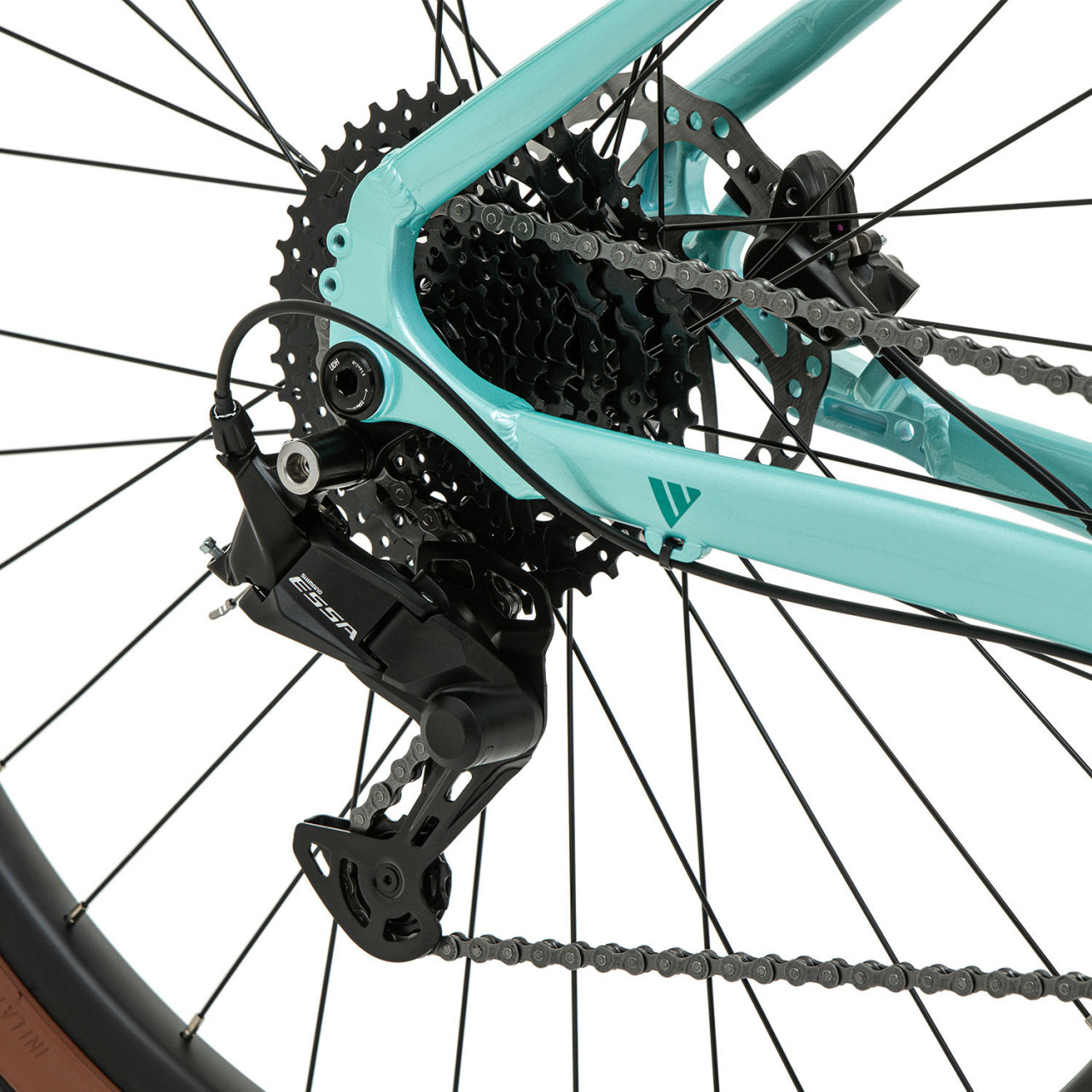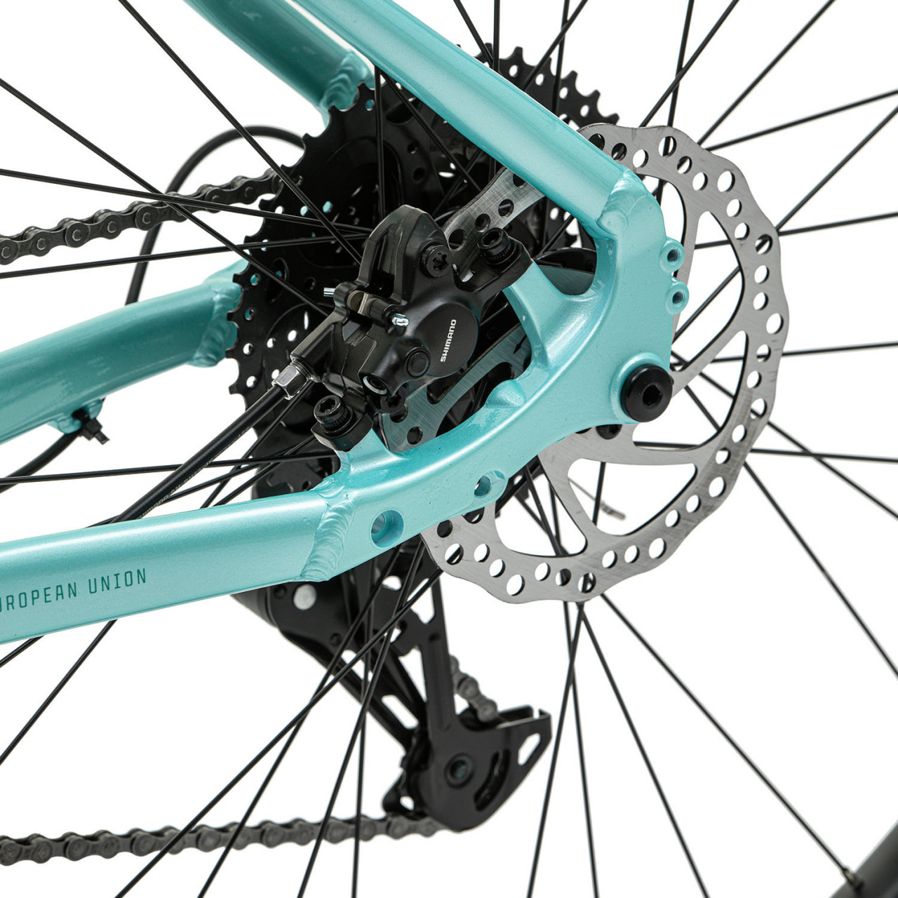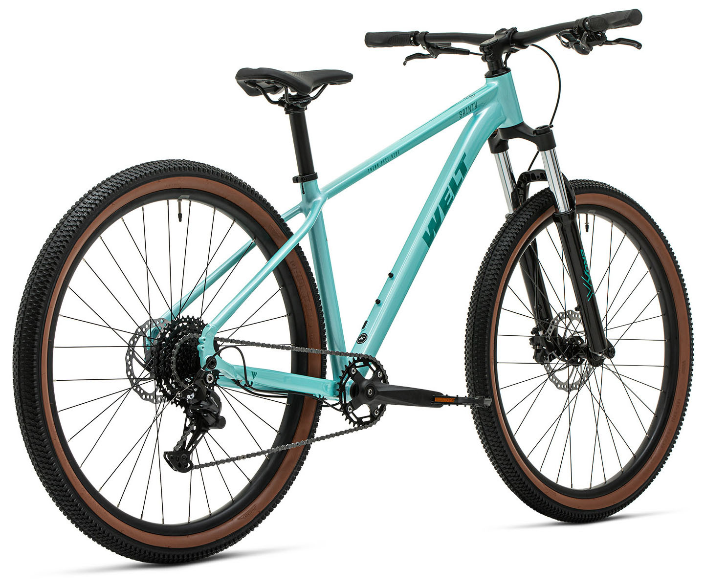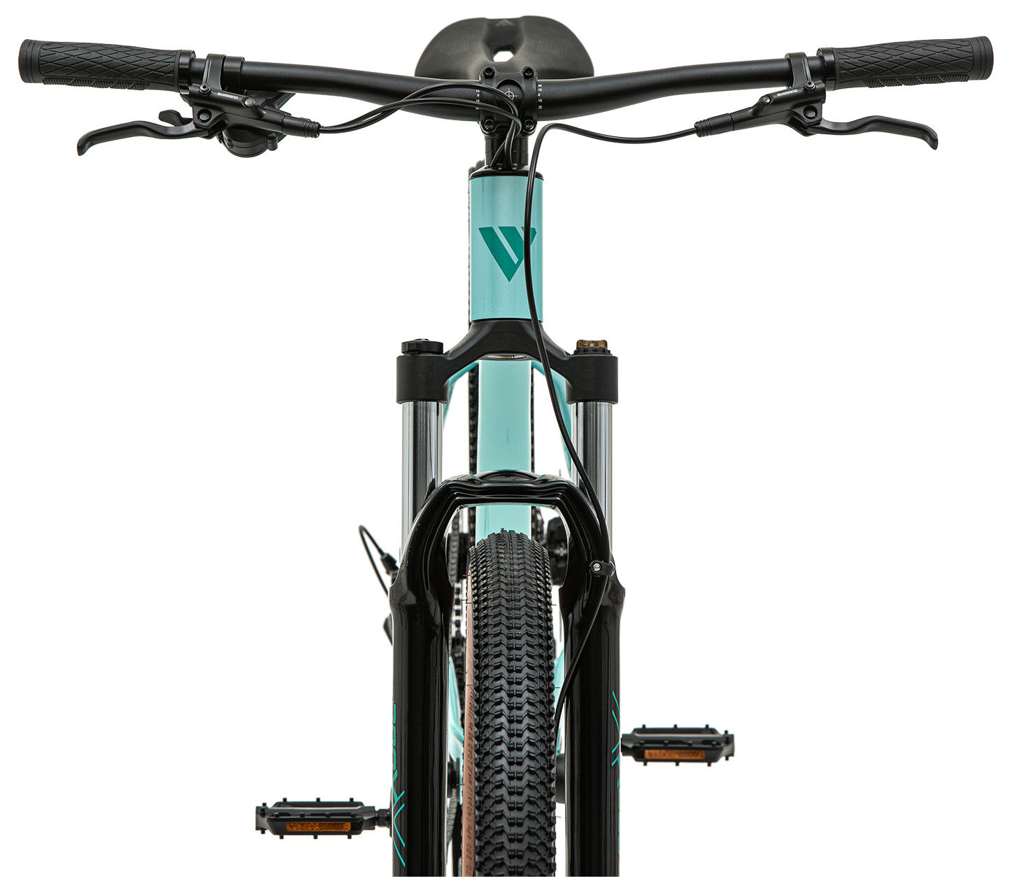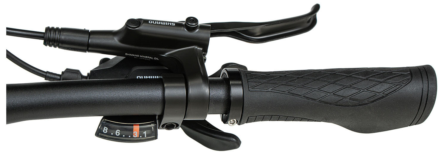 По трансмиссии всё честно и понятно: 1×8 на миксе Shimano (манетка Altus + задний переключатель Shimano ESSA), кассета 11–42 — для Орловских подъёмов и песчаных троп диапазона хватает. Тормоза — гидравлика Shimano MT-200 с роторами 180/160: хват стабильный, дозировка дружелюбная, для прогулок и «покатать активнее» — самое то.