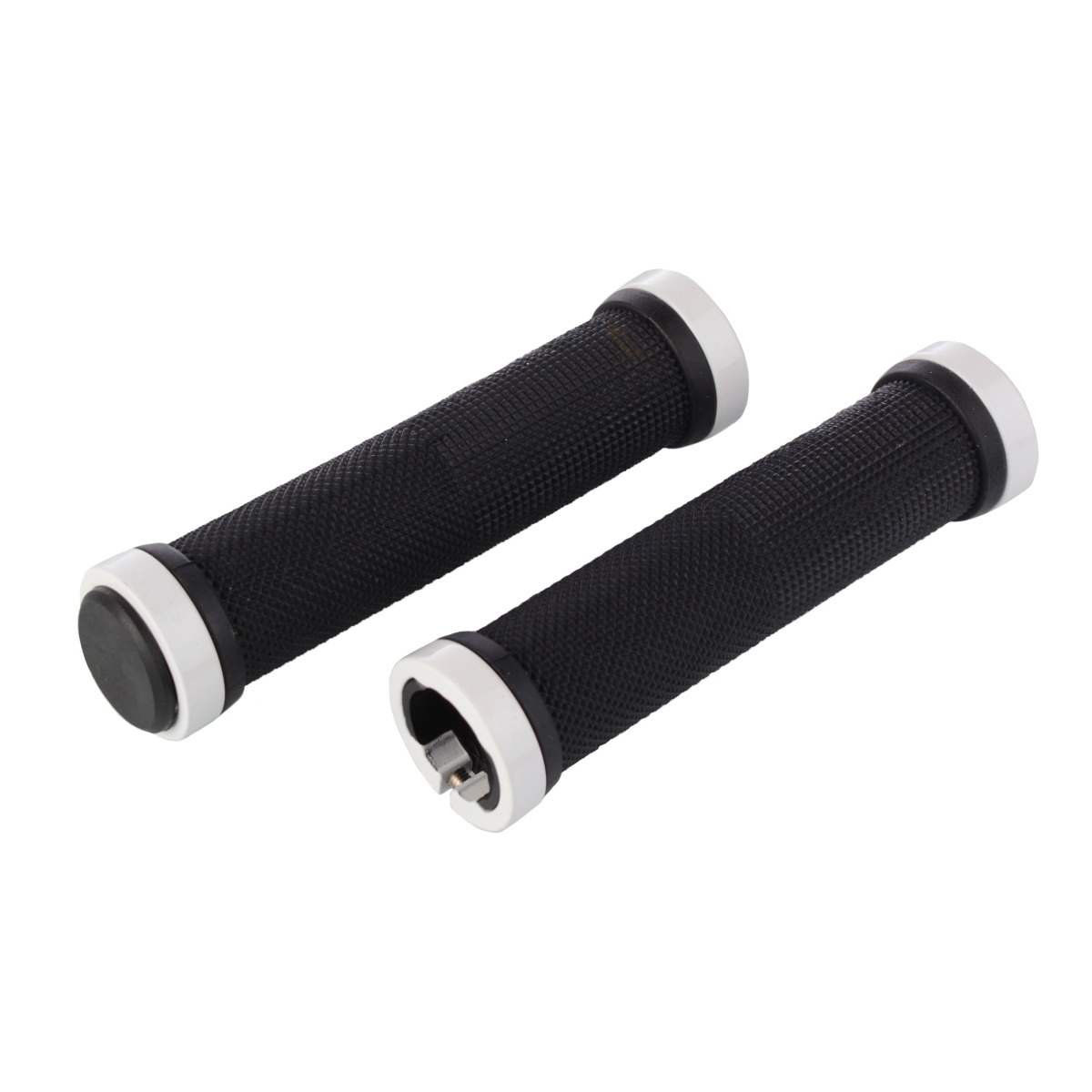 Грипсы велосипедные длиной 130 мм. Имеют цепкий рисунок корпуса, а алюминевые белые струбцины (хомутами) надежно зафиксируют их на руле.