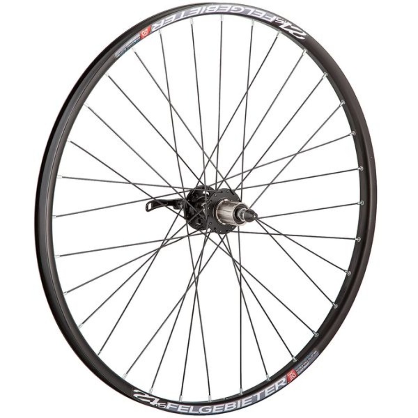 Колесо заднее в сборе, готовое к установке. Имеет стандартный размер 27,5". Оптимально рассчитано для MTB и городских велосипедов, также подойдет для гибридных, треккинговых, туринговых и некоторых прогулочных моделей. Рассчитано для установки с трещотками. Втулка стальная с 32 отверстиями, креплением тормозного ротора на 6 болтов. Ось выполнена из стали, фиксируется эксцентриком. Спицы стандартные стальные 14G. Обод Felgebieter, алюминиевый с двойной стенкой. Оптимальным сочетанием будут покрышки с шириной от 1,75 до 2,25", поддерживает колесо оптимальную нагрузку до 100 кг.