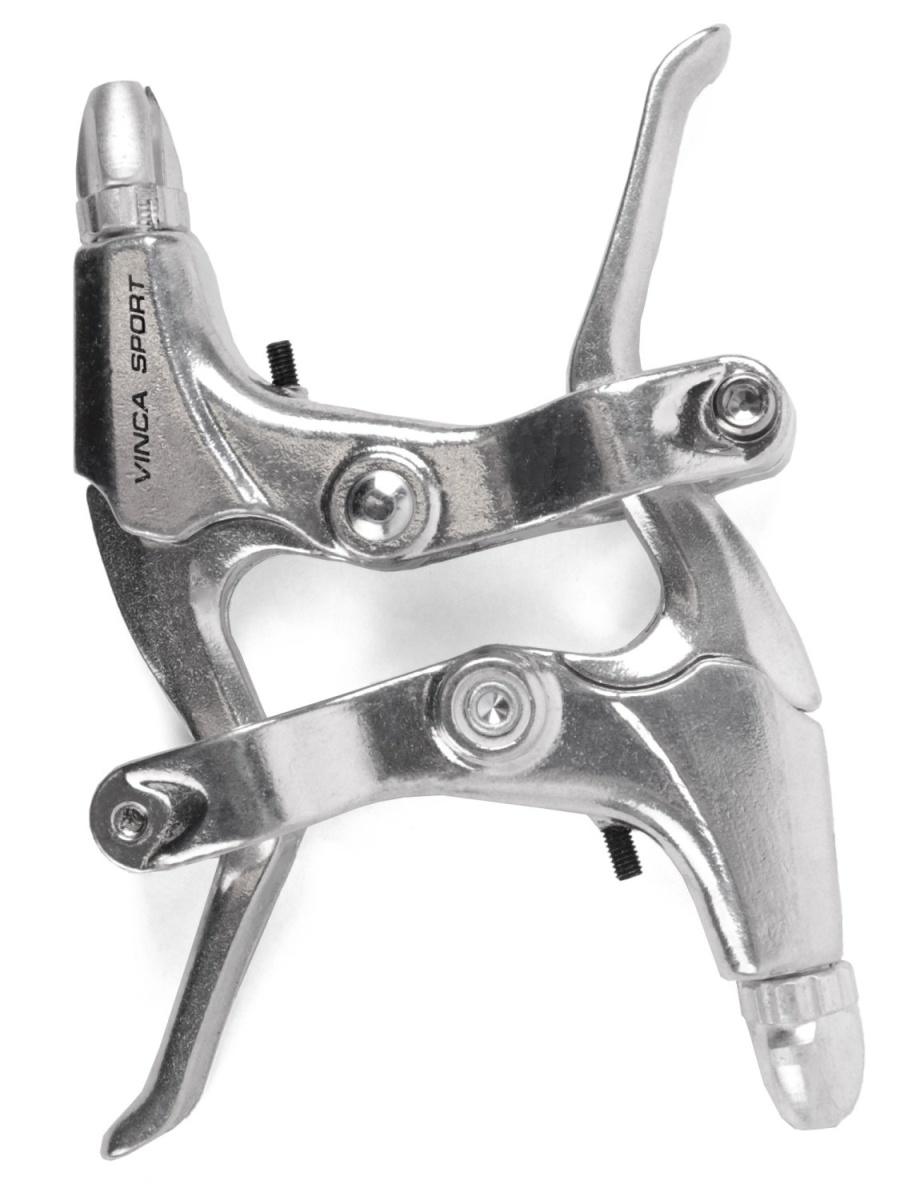 Тормозные ручки Vinca Sport детские (2 пальца) — лёгкие и прочные, выполнены из алюминия (цвет: серебро). Двусторонняя конструкция позволяет установить их с любой стороны руля. Эргономичная форма рассчитана на детскую руку и управление двумя пальцами. Тросы в комплект не входят.